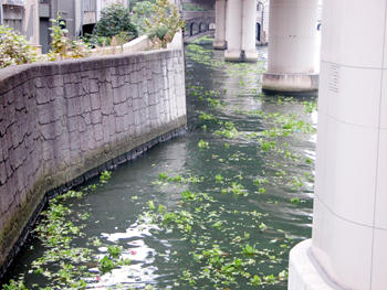 左下:毛馬水門を経て大川(旧淀川)へ、列をなして流れ出すボタンウキクサ(2007.10.28.)