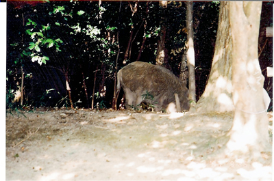 甲山森林公園の中でイノシシ1頭に出会った。 森の中から歩道に現れたが、人間達に物おじもせずに悠然としていて、すうーと森の中へ消えていった。