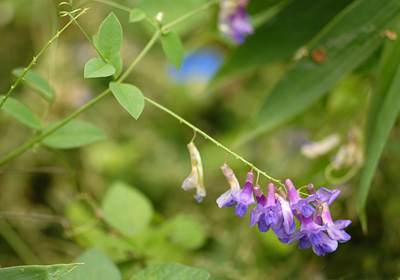 今年もいつもの土手にマメ科のオオバクサフジが咲いていた。今年は草刈がされなかったので他の草に圧倒され細々と咲いている。本種はレッドデータブックに指定されているところが多く大阪府でも絶滅危惧種U類に指定されていて当地でもここだけにしか見られない希少種である。