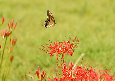 今年の厳しい暑さでヒガンバナの開花も遅れがちだが10月に入ったこの時期畦や土手のヒガンバナの開花が日々増えてきている。そこには各種の蝶が吸密に訪れ写真のキアゲハも花から花へと忙しく移動して吸密していた。