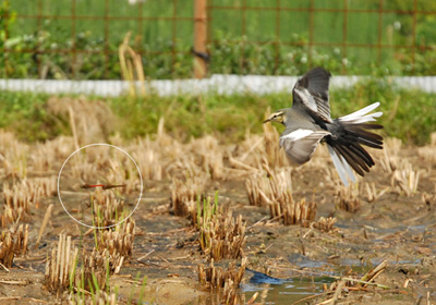 稲刈されたあとに出来た僅かな水溜りで十数組のアキアカネが産卵。そのためよく目立ち早速ハクセキレイが近づいてきて産卵中のアキアカネを狙っている。目の前でペアーを2回襲ったが失敗、3回目の襲撃で、飛立つやいなや産卵中のアキアカネ(円内)に突進。獲物を捕えたようでその後を追って近づいてみると獲物を咥えているのが分かった。連結で産卵中の後ろの雌だけを捕えたようだ。