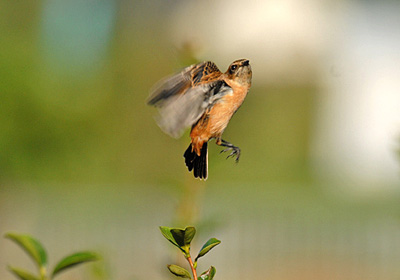 植木畑で見慣れない小鳥の群。植木の天辺にとまり辺りをうかがっている。数日前にノビタキの情報を得ていたのでノビタキの群であろうと直感。 夏鳥のノビタキを春には見かけた事はあるが秋のこの時期に見るのは初めて。調べてみるとどうも秋の渡りの道中のようだ。 冬羽の雄は夏の胸以外はほとんど黒装束の姿とはまるで違う鳥のようだ。