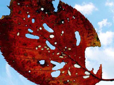 虫たちの仕業でしょうか、葉っぱにいくつも穴が 開いています。 この葉は今年の記録を残して、紅が色濃くなって来ました。 木枯らしに吹かれて舞い散るのも間もなくでしょう。