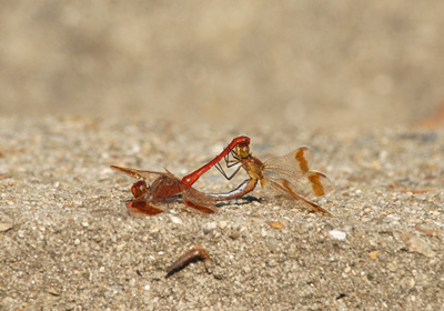 畑の縁を巡らしている溝のコンクリート上でミヤマアカネが交尾していた。この時期コンクリートや石、板切れの上でとまっている事が多いのはこの上が暖かいからでこのペアーは暖まりながらの交尾ということになる。けっこう長い時間の交尾だったがその後別の溝で産卵を始めた。