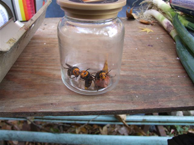 12月2日(日)妙見里山倶楽部活動日に、活動地内にあるオオスズメバチの巣から、 ハチ研究者が完全武装をして捕獲した。 ♂は数少なく生まれる時期が限られており、幸運にも1匹確保。 新女王蜂と運良く交尾出来ても、越冬出来ず死ぬ運命にあります。 働き蜂(♀)3匹も確保しましたが、働き蜂も越冬出来ず死にます。 女王蜂のみが越冬、来春夫々が新しい巣を構えます。