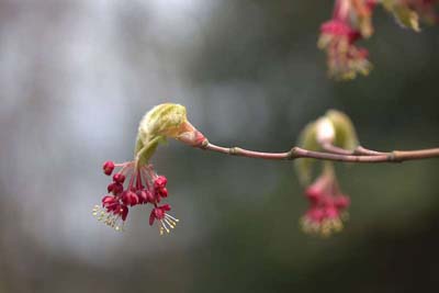 一つの花序に雄花と両性花が混生する。4〜5月紅紫色の小さな花を複散房花序に10〜15個つける花序 は有毛。花弁と萼片は五個。雄しべは八個、葯は黄色(山渓ハンディ図鑑より)。