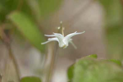 花には四個の花弁があり、その基部にそれぞれ長い距があって、四方に広がっている。この独特の花の 形を船の碇に見立ててイカリソウ(碇草)の名がついた(山渓ポケット図鑑春の花より)。