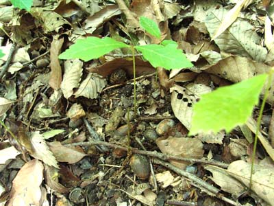 ころがり落着いた場所で、根をしっかり地中へ伸ばすことのできた幸運なドングリが若葉を 展開していました。落葉はドングリの乾燥を防ぎ、芽生えを助ける役割をも担っているいるようです。