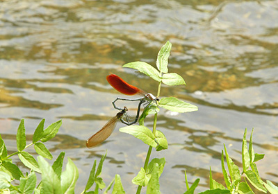 余野川の水際に生える草の葉や石の上でオオカワトンボの雄が縄張りを形成している。日当たりなど良い場所なのか、お互いが接近しているものだからしょっちゅう縄張り争いを演じている。雌も近くにいるが、あまり陽が当らない場所に陣取っている。 その雌が雄の縄張り場所に近づくとさっと連結して交尾する。写真のペアーもあっという間に交尾が成立したが、交尾後、雌は産卵に入る前に他の雄に交尾されてしまった。 トンボではこんな事は日常茶飯事。