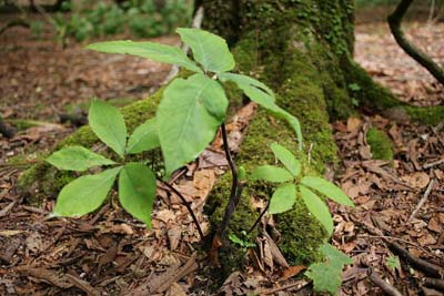 ギンリョウソウ(1)の芦生山の家に一泊後、ガイドの中根先生の案内で上谷コースを探索。花期は終わっていたが、この植物に出会えただけでここに来た甲斐があったというアシュウテンナンショウ(5枚葉)に出会えた。 鹿に食べられなかなか見られないということであったが、花をつけたコウライテンナンショウはところどころで見かけられた。