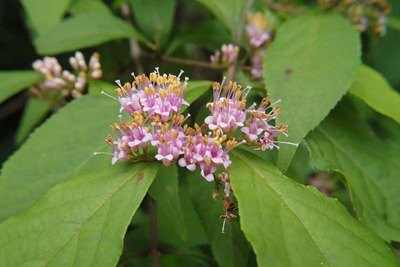 山歩きでムラサキシキブの実は良く見かけてきたが、花期は6〜7月。 この時期は蒸し暑く山歩きはあまりしなかったが今回水曜ハイクに参加 して初めてお目にかかった。 落葉低木。 樹高2〜3m。花は葉腋から集散花序を出して、淡紫色の花を多数つける。