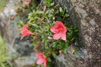 空の会・植物観察で西宮名塩駅・武田尾間を武庫川渓谷に沿って歩いた。その目玉の一つが渓流沿いの岩場などに自生するサツキ(原種)で、僅かな隙間に根を下ろし、遠目でもはっきり分る燃えるような赤い色の花をつけていた。 他のツツジより開花が1ヶ月遅く、旧暦の五月(皐月)(現在の6月)の頃に一斉に咲き揃うところからその名が付いたと言われる。