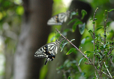 夕方妻が庭に蝶がとまっているというので見に行くと、2頭のアゲハが植木にとまっていた。写真手前の1頭は最初翅を広げていたがやがて翅を閉じた。午後9時ごろには激しい雨が降ったがそのままの姿勢でとまっていた。 結局ここで一泊したようだが、午前7時にはもう姿はなかった。
