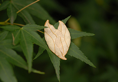 この時期林縁を歩いていると、飛び出してきたり葉の上でとまっている蛾によく遭う。この日も葉の上にとまっている蛾を何頭か見つけたがその中に全開長4cmほどのヤマトカギバ2頭が絡まってとまっているのが見られた。おそらく交尾中だと思われる。それにしてもこの蛾の模様左右の翅と胴体に線の紋があり、とまるとそれが1本の線に繋がって見えるのは面白い。何か意味があるのだろうか。 撮影者:横田 靖 さん 撮影場所:池田市伏尾町(2008.7.10.) 目次へもどる / 次の写真へ |