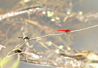 この冬、溜池の水が干上がったところもあり羽化したトンボの数が少ない。トラフトンボ、ヨツボシトンボ、マルタンヤンマが減り、写真の赤い色のショウジョウトンボと黒い色のコシアキトンボも例年になく少ない。