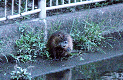 7月12日、セミの羽化の観察会の下見で、大川沿いにある桜ノ宮公園を訪れた。暮れなずむ岸辺の草むらで何やら動いている。猫かと思ったが、よく見るとヌートリアだった。