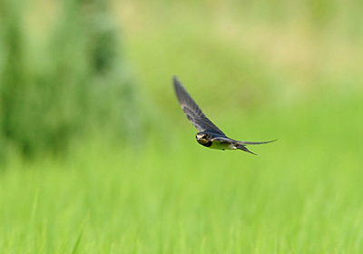 一枚の稲田の上スレスレを10羽ほどのツバメが飛び交っていた。おそらく昆虫を捕っているのであろう休みなく飛んでいた。 近くの田ではツバメがあまり見られないのでここは昆虫が多いのかもしれない。少し離れた田んぼではコシアカツバメが同じように飛んでいた。