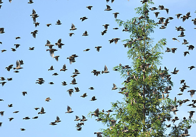 ミヤマアカネの観察中、近くの樹にムクドリの群がとまっていた。それが移動する時は壮観。ざっと数えてみると500羽近くいたと思う。どこを塒(ねぐら)にしているのであろうか。ムクドリが街の街路樹を塒にして、その糞や鳴き声で住民の苦情になっているというニュースをよく耳にする。