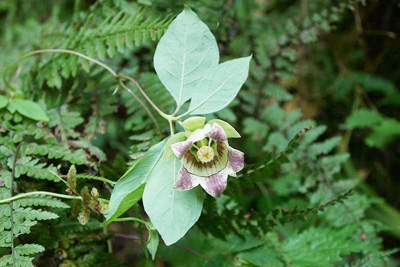 花はつるの側枝の先に下向きについているので、写真を撮る時は上に持ち上げざるを得ない。 花の直径は2.5cm前後の鐘形で先は浅く5裂し、外側に反り返っている。内側に紫褐色の斑点があり、爺のソバカスに似ていることから別名ジイソブの名がある。花期は7〜9月。