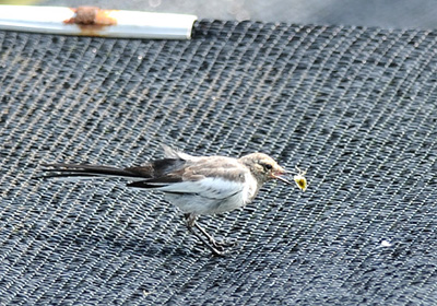 水を張った畑に行くと、前日も見られた数羽のハクセキレイが水中の獲物を探しまわっていた。一羽が獲物を捕えると隣の畑の黒いシートの上で食べ始めました。獲物はトンボのヤゴのようでおそらくウスバキトンボのヤゴと思われる。このハクセキレイ、成鳥ではなく幼鳥のようだ。