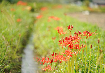 この週始めにヒガンバナの花を今年初めて見たが、この日広い範囲の畦や土手でちらほら咲きのヒガンバナが見られた。 写真の場所は溝に沿ってヒガンバナが密集して生えているので満開の時が楽しみ。