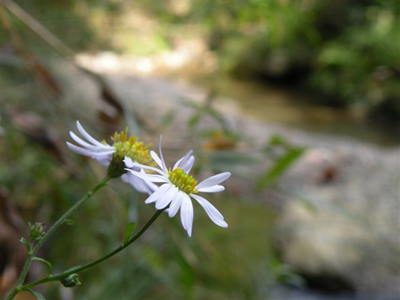 槇尾川上流の川辺に咲くノコンギクです。まわりにはアケボノソウ、ミズヒキなどいろんな花がひっそり咲いています。人が来ない川辺ですが懸命に咲いています。