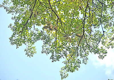 この場所は例年アケビの実が見られるところ。10m以上に伸びたセンダンの先端辺りにアケビの実がなっているので、双眼鏡で見なければ判らないほど。 よく見ると今年も実が鈴なりになっている。上の方は明るいせいかアケビの果皮は白っぽい。