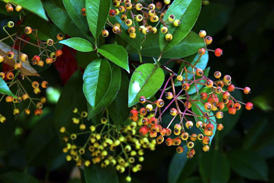 関東以西の温暖な地域に生育する常緑樹。春の若葉は赤く美しい。成熟するにしたがって 緑色になる。花は5〜6月に咲き、果実は秋から冬にかけて赤く熟す。写真では果実頂部に 顎片が残っているのが分る。