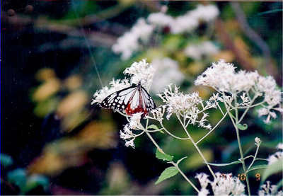 渡りの途中であろうか、山深い北摂霊園付近でアサギマダラに出会った。 白い花のヒヨドリバナにとまって、盛んに吸密行動をとっていた。
