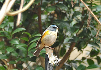 ルリビタキが明るいところに出て来て地面にいる虫を狙っていた。雄のこの個体、背中はまだ黒と青色が混ざった色で鮮やかな青色にはなっていない。非繁殖期のこの時期ルリビタキは昆虫類や木の実を食べているが、実際によく見るのは枝や棒の少し高いところから地上の昆虫を捕らえ直ぐ戻って樹上で採食している光景がほとんど。