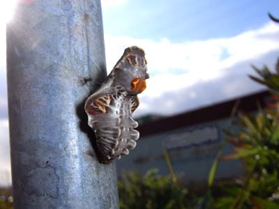 土手の草刈の試練を生き抜き、蛹姿となって、希望の春が 来るのを待っているジャコウアゲハです。 この川辺では年々その数が減少してきています。今冬はこの 1頭しか見つかりませんでした。