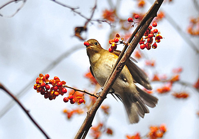 ルリビタキの雄の若鳥が食べているのはツルウメモドキの実、この実ウソの好物だがウソはまだ姿を見せない。他の鳥にはそんなに人気がないようだがヒヨドリ、シロハラそれにこのルリビタキがこの実を時々食べているのを目にする。
