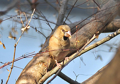 どこからともなく飛んできたシメが近くのモミジの樹にとまった。食べている様子を見るとたまたま近くに実があったので何となく食べたような感じで直ぐ他へ飛んで行ってしまった。ただアトリの仲間はこのモミジの実を好むようなので、この実が目的で飛んできたのかもしれない。