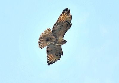 この日は上昇気流が強いのかタカが舞うのがよく見られた。山の方から飛んで来たノスリが真上まで来て尾羽と翼を精一杯広げホバリング飛行を始めた。