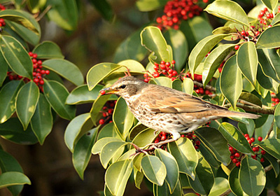自宅の向かいのクロガネモチの樹にヒヨドリ、メジロ、ツグミが次々やって来て赤い実を食べている。 ヒヨドリは周りを見張り、他の鳥が来ると追っ払っている。見張りに躍起になっていてあまり実を食べていない。 しかしツグミは近くの屋根で様子を覗っていて、何もいないと見るやさっと樹にとまり実をせっせと食べていた。