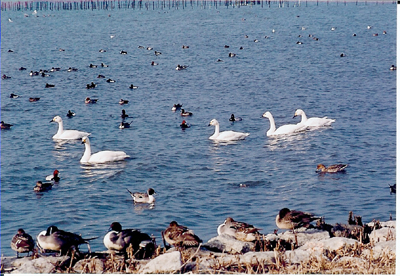 琵琶湖湖岸にコハクチョウが飛来していて、純白な姿を優雅に湖面に浮かべていた。
