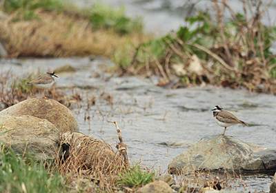 久しぶりに川原に行って見ると一ヶ月ほど前にいた2羽のイカルチドリが健在。この2羽おそらく番(つがい)だと思う。 昨年この場所で3羽の雛が育ったので今年も産卵を期待しているが、産卵に適した砂礫地の状態があまり良くないので上手く行かないかもしれない。この川原は人の出入りが多く産卵には決してよくないのだが、逆に天敵であるカラスが近づき難いので利点もあるところ。 4月の上旬くらいに産卵が期待出来るのだが。