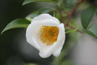 ナニワイバラは中国中南部の減産で、美しい花が咲く原種の バラ。園芸種でも人気がある。 一重の花びらで夏椿のような花の形をしている。小葉はは3枚 で長楕円形、光沢がある。 開花は一季咲きの早咲き性(四月下旬)です。