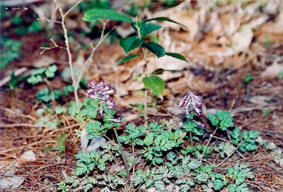 千里第4緑地の林床にムラサキケマンが赤紫の可愛い花をつけていた。 あたたかい日が多かったせいか、例年よりは開花が早いように思われた。