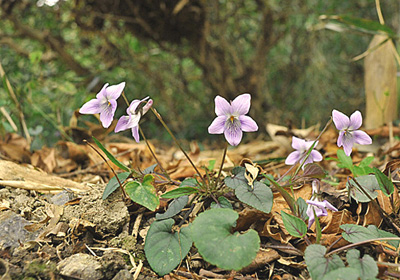 ナガバノタチツボスミレはタチツボスミレによく似ているが半日影の林縁を好んで生息している。花期も当地ではタチツボスミレよりも少し早い。本種は花が終わりに近づくと茎葉が細長くなるのが特徴。