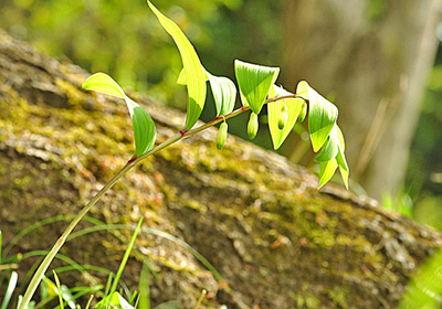 山裾の雑木林の林床にホウチャクソウ、ナルコユリ、フタリシズカ、オカタツナミソウ、そして写真のアマドコロがあちこちに出だした。 花を付けているのはまだフタリシズカとこのアマドコロだけ。そのアマドコロもまだ蕾だが、よく見ると写真の株は葉のつけ根に花を1個づつ付けているが、隣の株は花を2個づつ付いてた。