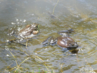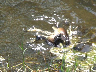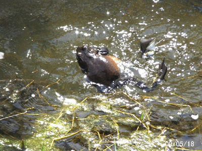 ![]() 午前9:34 西明寺川:宝塚市 この場所を以前から占有している ウシガエル。 | ![]() 13:01 この占有地に、他から侵入してきたウシガエル。雌雄を決するべく、近距離で鳴き合戦を挑む。 | ![]() 13:02 鳴き合戦では決着付かず、突然肉弾戦に入る。体勢不明 |