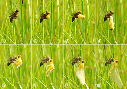 赤トンボの仲間、ヒメアカネが10頭程羽化していたが、その中にこれから羽化するヤゴがいたので羽化を最初からみる事が出来た。 本種の羽化タイプは倒垂型で、殻から出た後、体を倒垂したまま足が固まるのを待つC。 その後頭を一気にもたげ、腹部を殻から抜き出すDE。 @からGの状態まで約1時間経過しているが、その後翅を広げ体が乾くのを待って飛立つ。