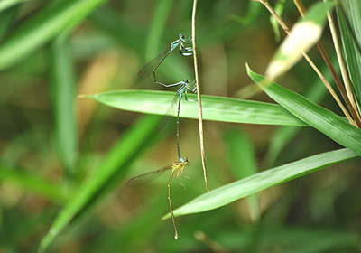 早朝溜池に行くと多数のモノサシトンボがこちらの動きに反応して次々に飛び上がる。しかし直ぐ近くの樹の葉などにとまる。それにこのトンボ、早朝から連結・交尾が多く見られる。 この日もほとんどのモノサシトンボが連結状態で、中に写真のような三連結もいた。上から雄、雄、雌で最初真中の雄と下の雌が連結して、その後一番上の雄がこの雌を目撃して連結に挑んで誤って雄に連結してしまったと思われる。 このような三連結は他のトンボでもよく見られる。