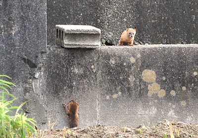 2匹の仔イタチを連れたイタチが通りかかったので見ていると、一匹の仔イタチはまだ頼りなく親が目を離せない状態。写真は、もう一匹の仔イタチを探しに行こうとした親がコンクリートの壁の上に登ると、仔イタチも同じように登ろうとするが上手く行かず登らないよう親イタチが制止している様子であった。 この後、もう1匹の仔イタチが来たので親も下に下り親子揃ってどこかに消えていった。
