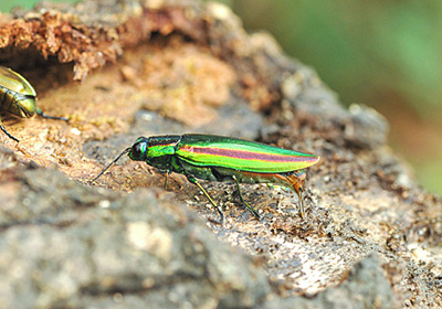 クヌギの老木にはいつものようにカナブンやスズメバチが樹液を求め群がっていた。その中に輝くタマムシが歩き回っていたが、最初何をしているのか判らなかった。 よく見ると産卵管を出していたので、真横から見てみると産卵管を木肌に押し付けながら前に進んでいて、途中穴や割れ目があるととまり産卵管を穴に差込んでいる。どうやらタマムシの産卵のようだ