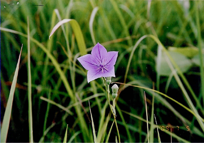 青山台の府有地、黄色のミヤコグサ・赤紫色のウツボグサ・白いチガヤの終わり頃、緑地の中に自生しているキキョウが薄紫色の花をつけた。 わずか一株だけではあるが、きれいな花が目立っていた。