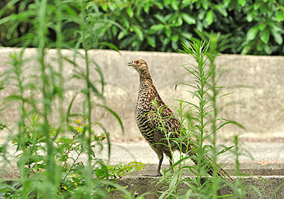 草むらに入った途端キジの群5、6羽が散り散りになって草むらの中に逃げて行った。幼鳥を従えた家族のようで、離れてしまったのでお互いの確認のためか盛んに鳴声を発していた。その2時間ほどあとに目の前に幼鳥と思われる雌のキジが現れ、こちらに気が付いているにもかかわらず逃げずに盛んに鳴声を発して仲間を探している様子。