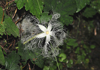昼間しぼんだカラスウリの花しか見ていないのでこの日は夕方から花が開くのを観察。午後6時ごろから蕾が開き始め7時過ぎに開き切った。 本種は雌雄異株で写真は雄花。受粉を助けるスズメガのの訪問を待ったが、残念ながら見られなかった。