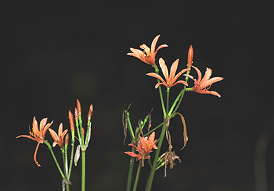 夕方の薄暗い雑木林の林床にキツネノカミソリが花を咲かせていた。畦や土手で咲くキツネノカミソリの生息地と違いここは陽があまり射さないので花茎がひょろ長くしかも花茎が固まって生えているのではなく地面からバラバラに出ていた。